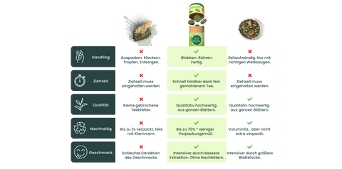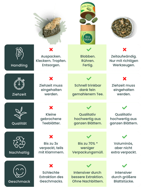 1 TeaBlob = 1 Tasse. Convenience bleibt erhalten und kein Dosieren erforderlich.